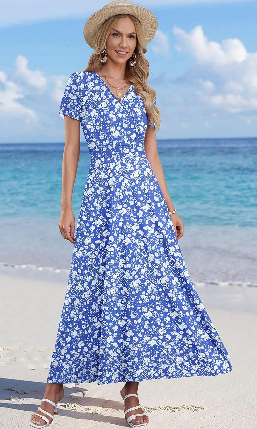 Casual style, two side pockets, short sleeves, unique cross wrap maxi dress with deep V-neck, ankle Length. Empire waist with front belt could flatter waistline easily. The Floral Print is random, we couldn't ensure the position of floral print on each dress, but they are definitely made of same pattern fabric.