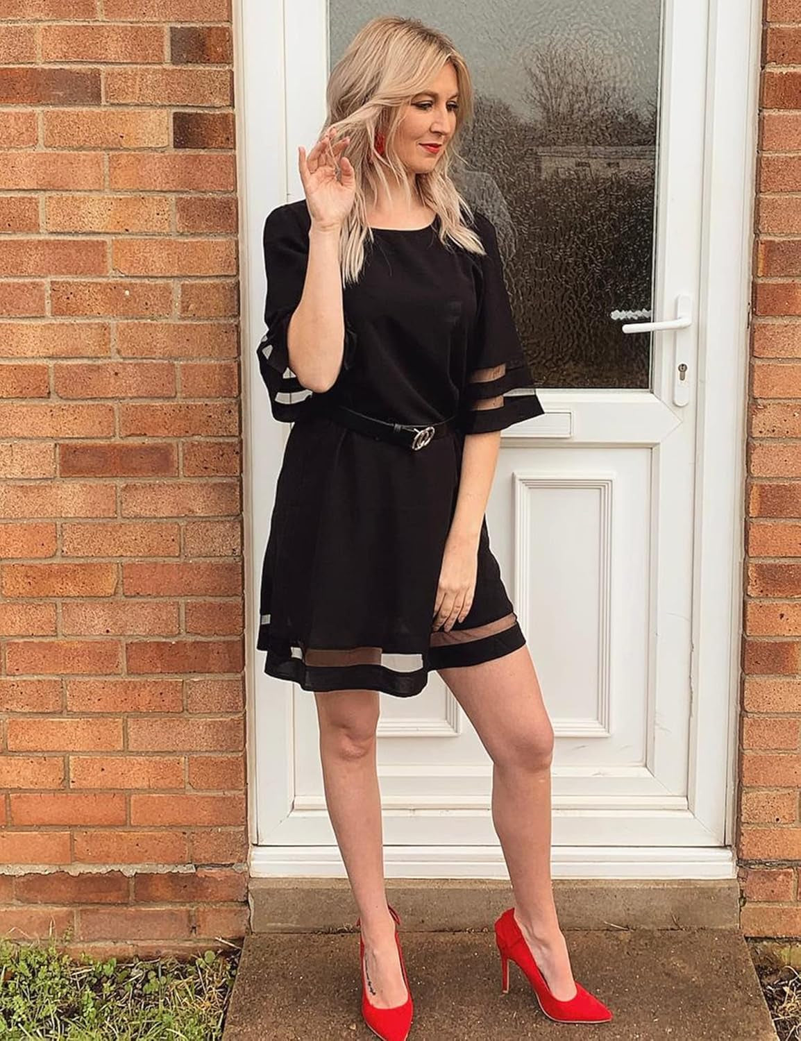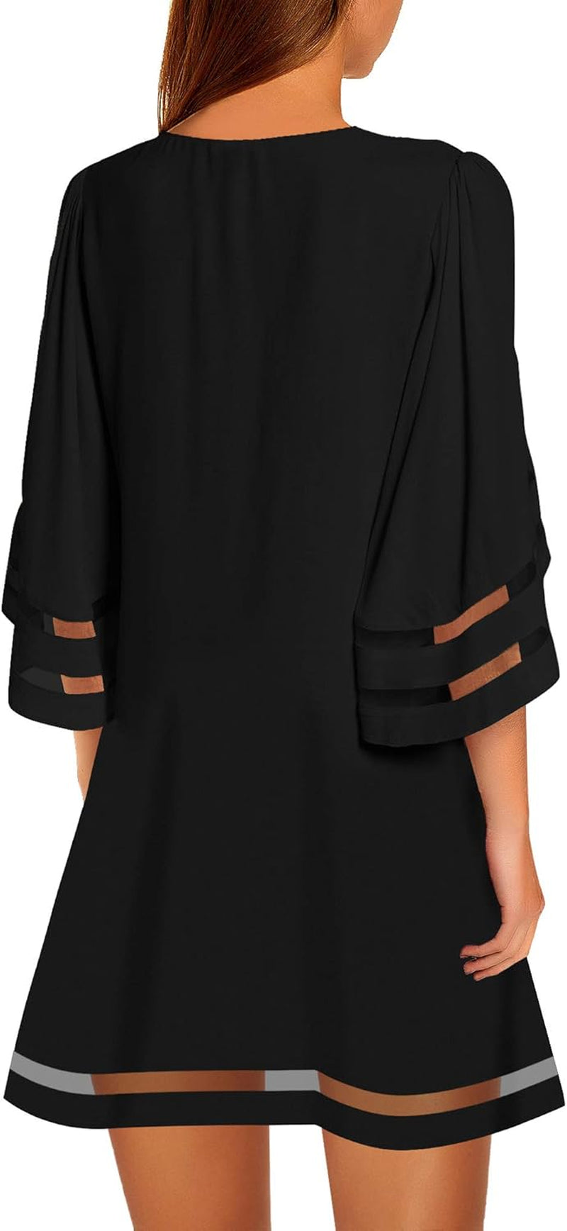 Feature: A-line Dress, round neck, 3/4 bell sleeve, mesh panel embellished with cuffs and hemline