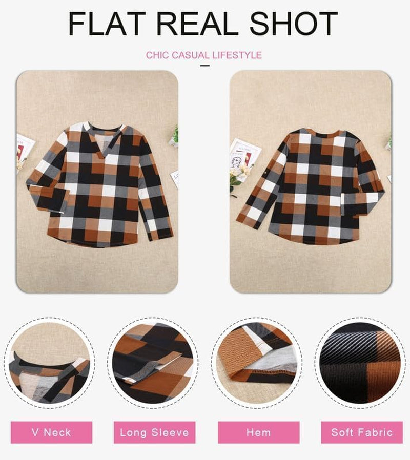 Womens Basic Casual V Neck Plaid Print Cuffed Long Sleeve Work Tops Blouses Shirts S-3XL