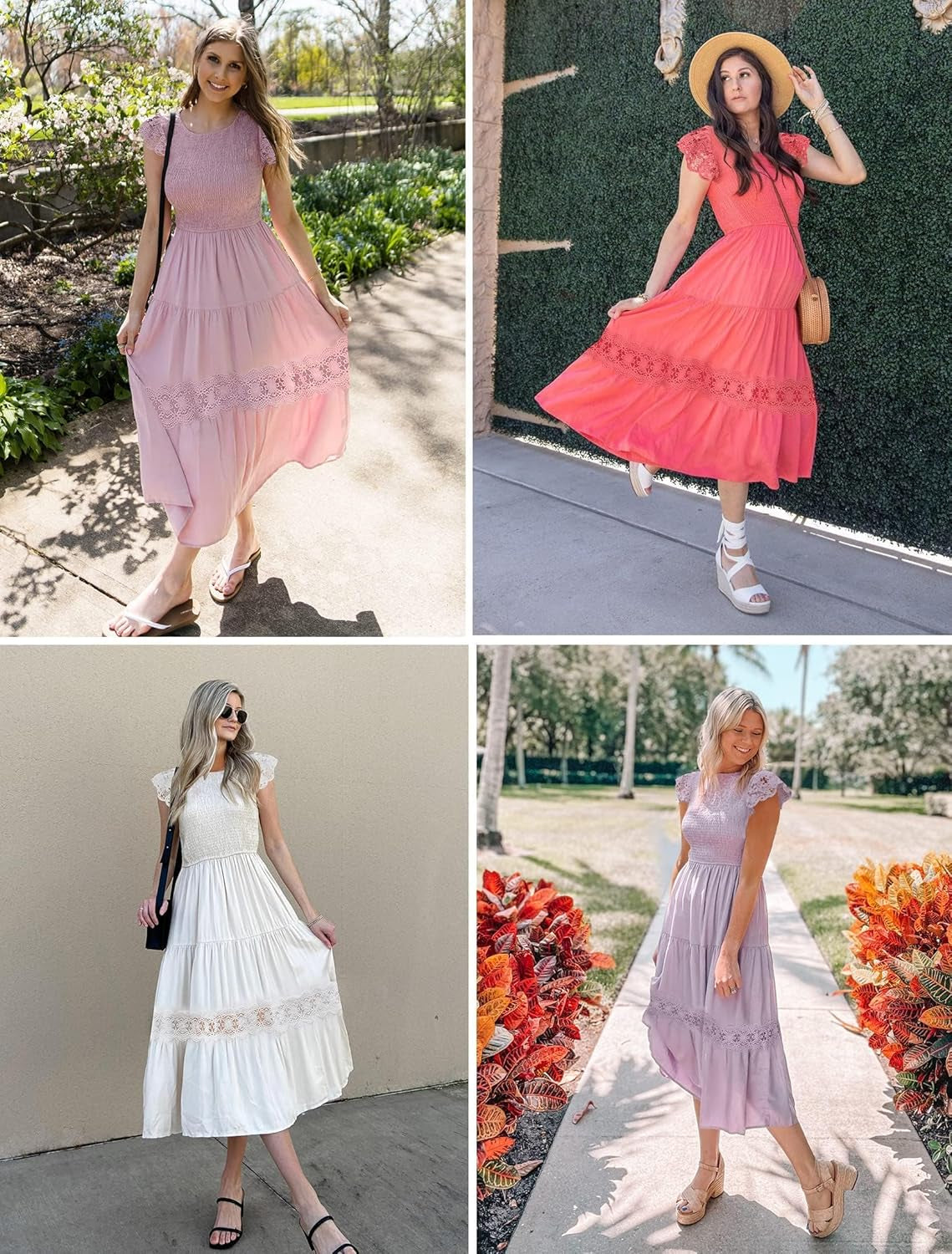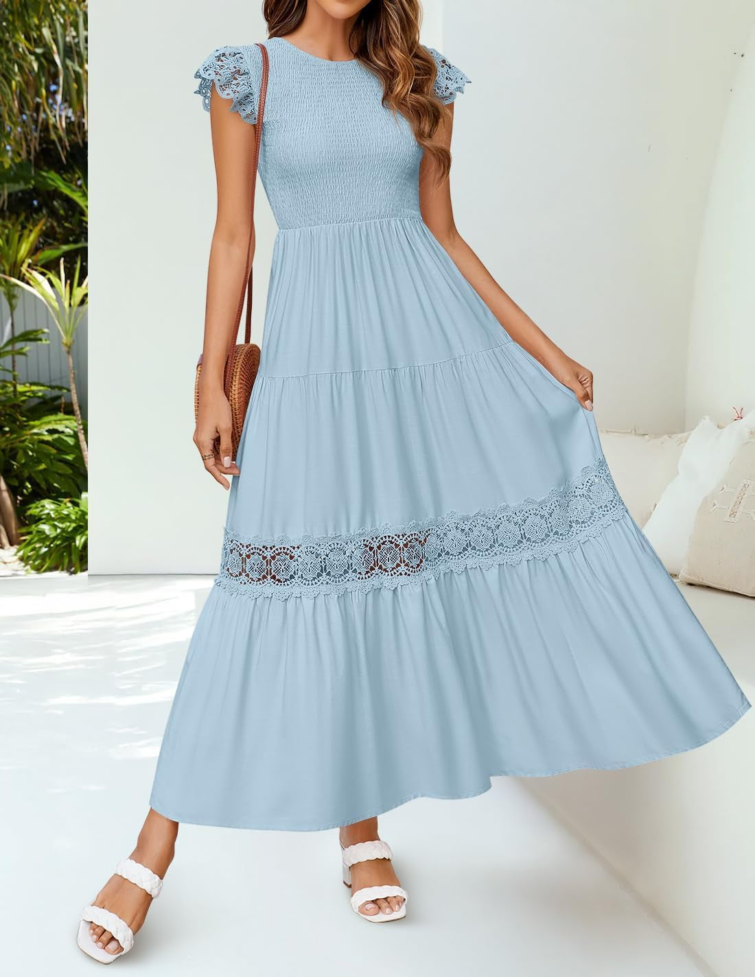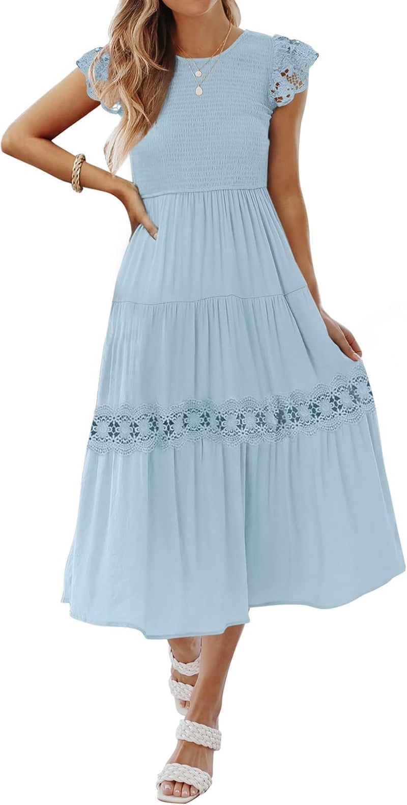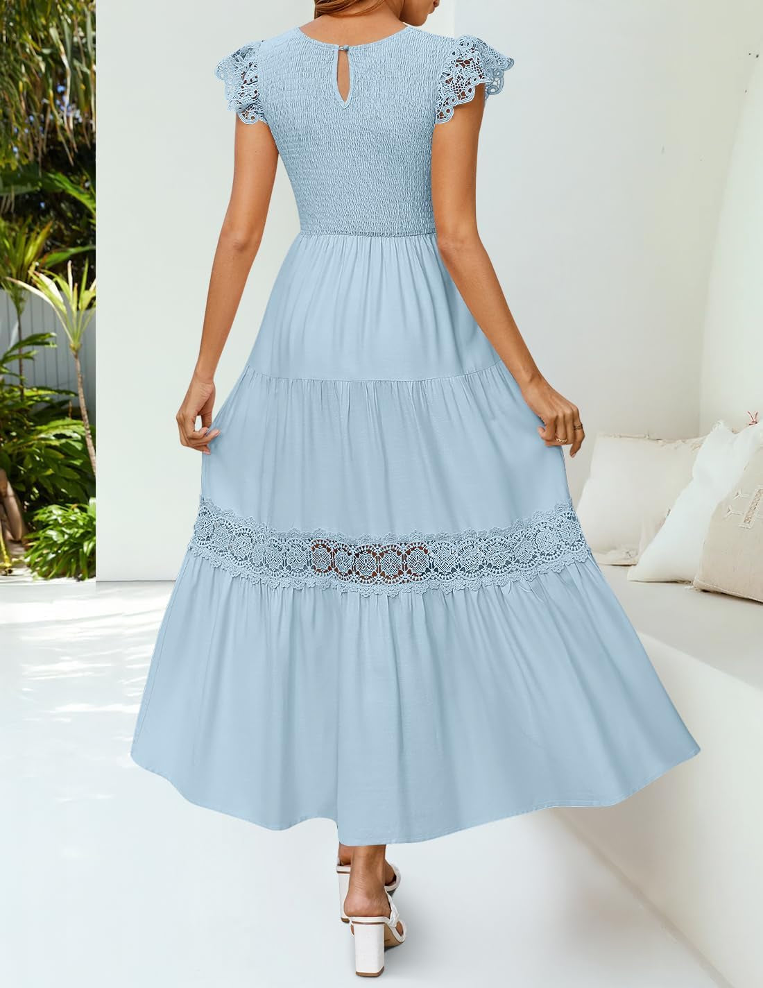 Features: Crew Neck, Lace Flutter Sleeve, Smocked Bodice, High Waist, Hollow Out Tiered Skirt