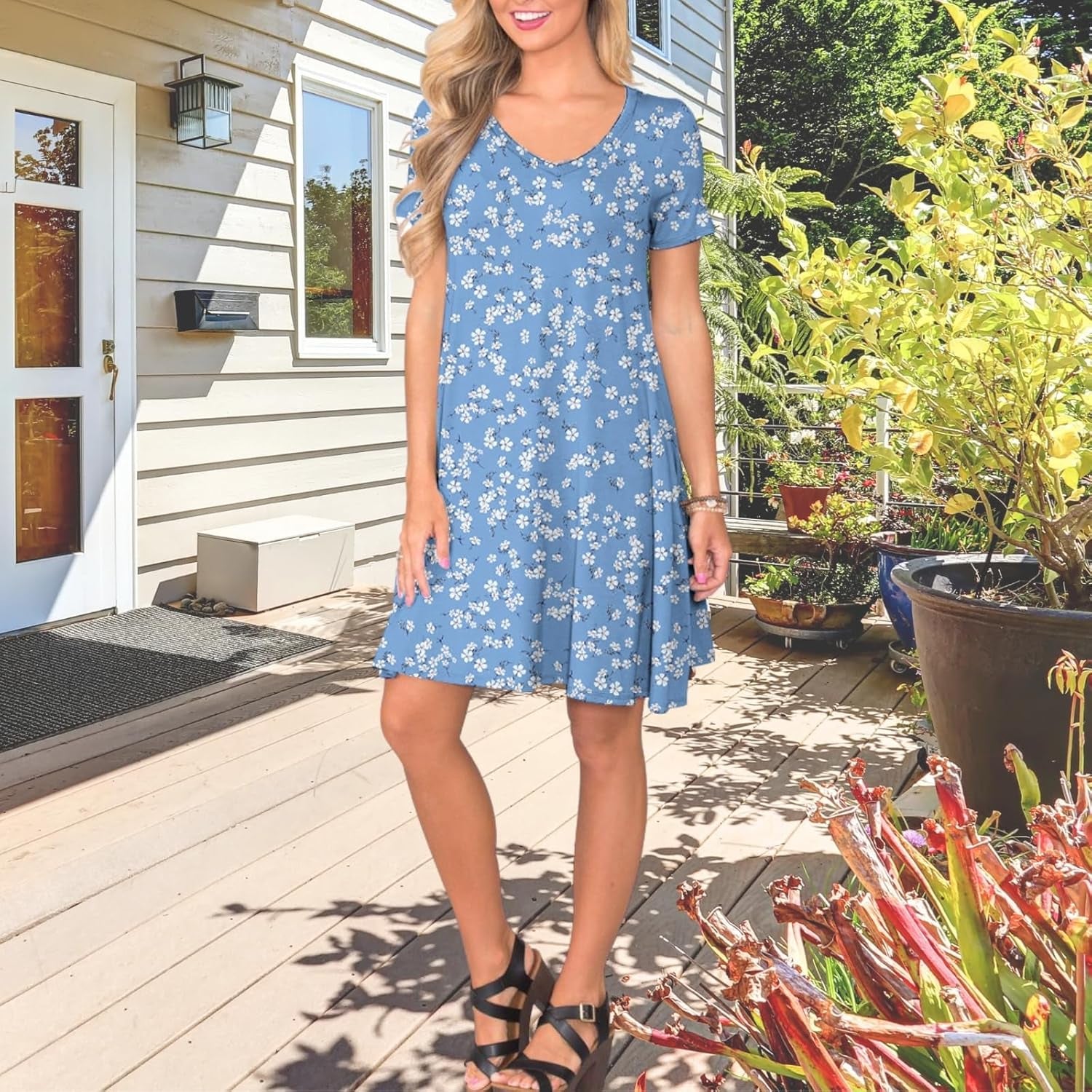 This women dress is v-neck, short sleeve, knee-length, swing, loose and comfortable, cover hips and come with pockets.