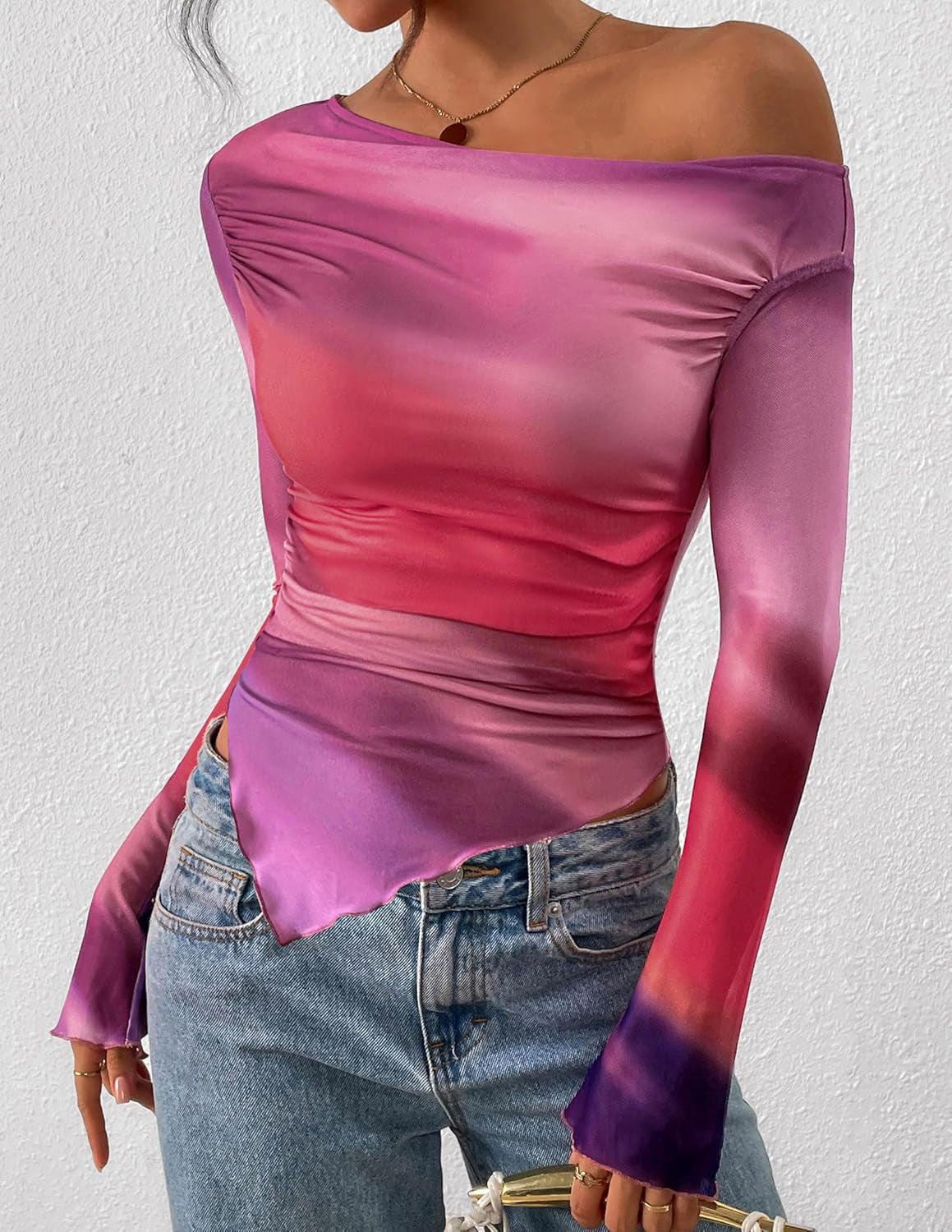PRETTYGARDEN Asymmetrical Slim Fit Floral Shirts for Women One Shoulder Going Out Tops
