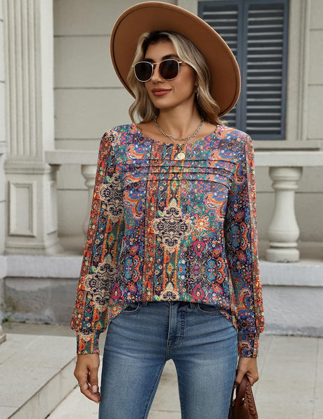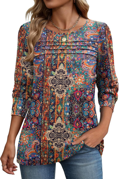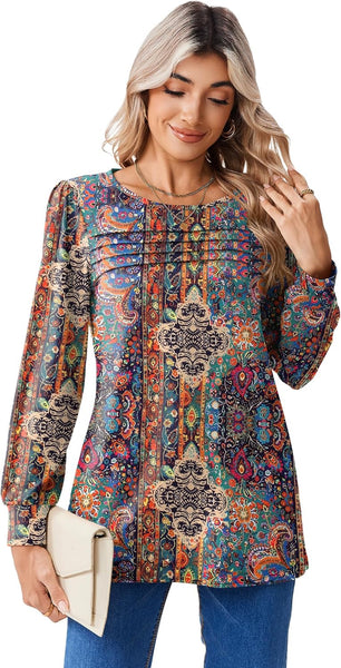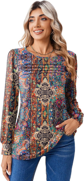 Long Sleeve Shirts for Women Casual Fall Fashion Crewneck Pleated Tunic Tops Work Outfit Blouse