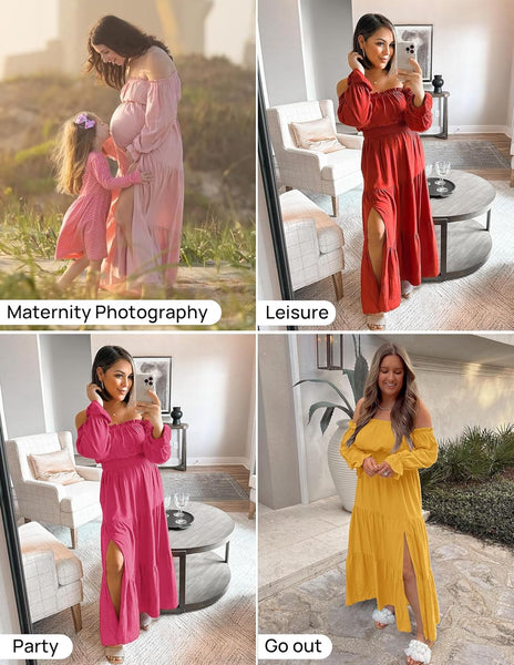 Women'S 2025 Boho Sexy off Shoulder Long Sleeve Smocked High Waist Side Split Flowy a Line Tiered Long Maxi Dress