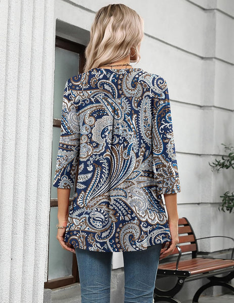 Blue Floral Tunic Tops for Women 3/4 Sleeve