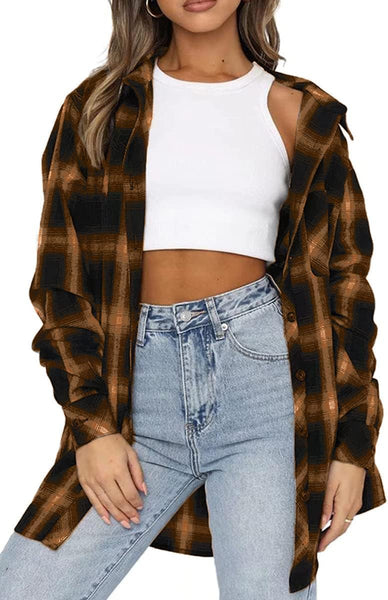Product description CHYRII Women's Fall Flannel Plaid Button Down Shirts Casual Oversized Blouses Tops with Pockets The Fall Flannel Shirts Featuring: Drop Shoulder Oversized Fit/Loose Fit Buffalo Plaid Check Pattern Button Down Front Front Pockets...