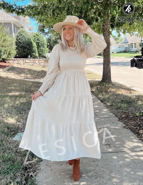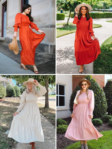 Product description ZESICA --- Classic & Fashion Feature --- Crew Neck, Long Sleeve, Smocked Bodice, High Wasit, A line, Tiered Skirt, Solid Color, Maxi Length, Flowy Fit. Occasions: Great for daily, vacation, wedding, date, anniversary,...