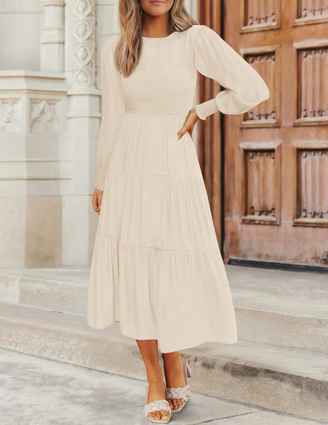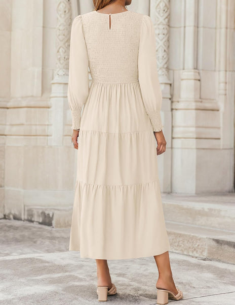 Women'S Casual Long Sleeve Crew Neck High Waist Smocked Flowy Tiered Midi Dress