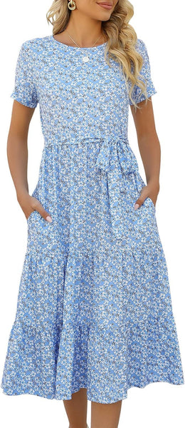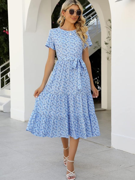 Lyrur Exclusive! Make it Cute With Staying Comfortable in The Lyrur Ready for Sunshine Ruffle Babydoll Tiered Midi Dress. Knitting Fabric Shapes this Casual Dress that has Short Sleeve, a Rounded Neckline, Undetachable Belt,and a Fitted Bodice. The Relaxed Fit Silhouette is Punctuated with a Tying Waist Sash before Ending at a Tiered Midi Hem. Pullover Style
