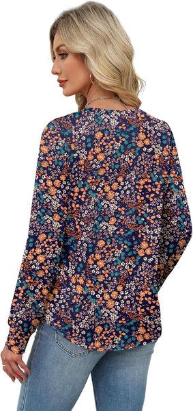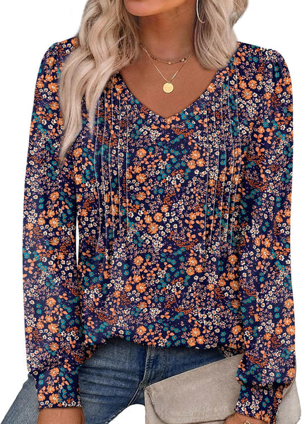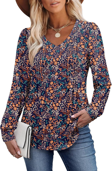 Womens Long Sleeve Shirts Pleated V Neck Curved Hem Fall Winter Tunic Tops Blouses Print