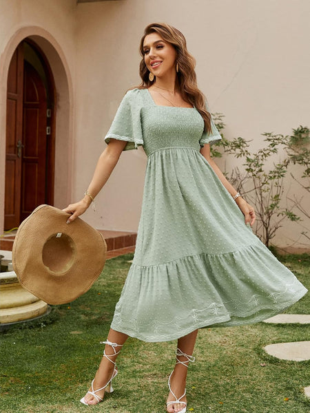 ABOUT DESIGNDED: It with a stretchy,square neck formfitting elastic smocking,a flowy ruffle hem and butterfly sleeves.