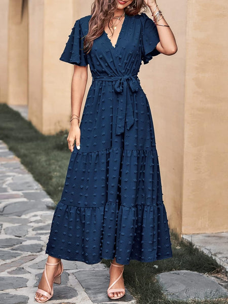 Womens Summer Swiss Dot Maxi Dressses Wrap V Neck Flutter Short Sleeve Boho Casual Flowy Long Wedding Guest Dress